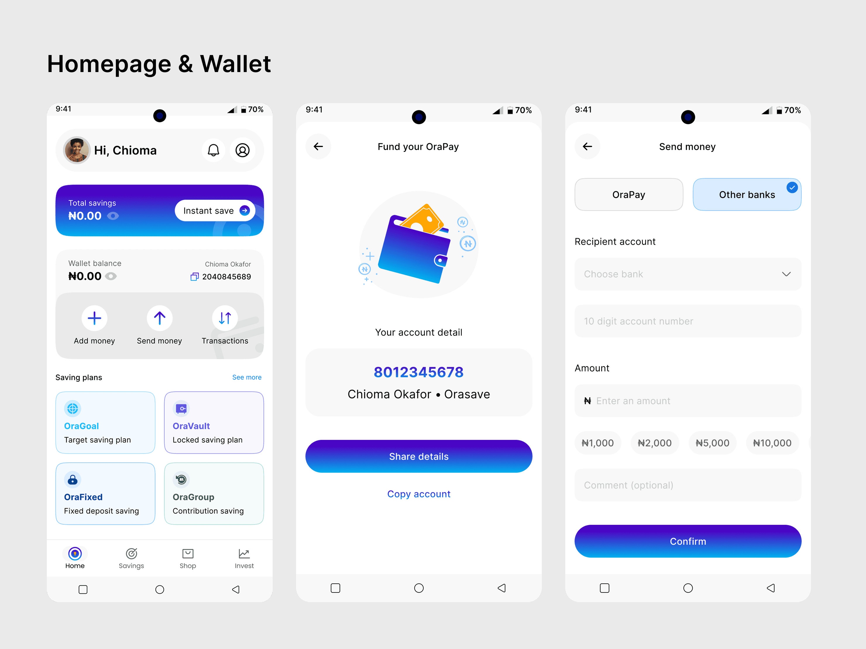 At the top has the total savings surfaced clearly, with a clear CTA “Instant Save” that opens the quick saving flow (OraFlex). Below that sits the wallet balance, treated as a supporting element rather than the main focus. Orasave is first a savings product, not a banking app—and the hierarchy reflects that. But to facilitate easy money transfer in and out, the wallet system was introduced. Quick actions like Add money, Send money, and View transactions are always within reach, reducing friction for repeat tasks and eliminating the need to dig through menus.