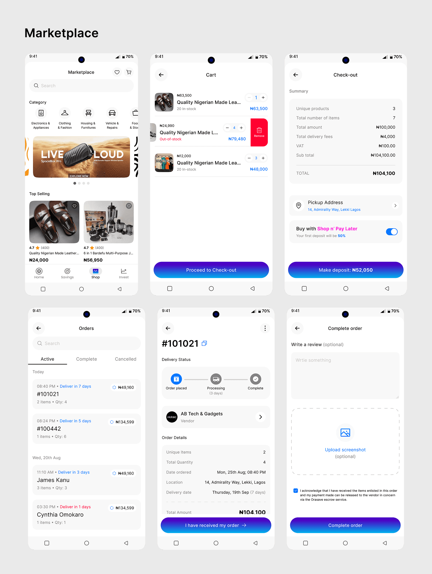 After check-out, users can track their orders through clear delivery stages, manage active and completed orders, and confirm receipt directly within the app. This confirmation triggers the release of funds to the vendor, reinforcing trust and accountability on both sides. Optional reviews and proof of delivery further strengthen confidence in the system, making the marketplace a seamless and reliable extension of Orasave’s financial ecosystem.